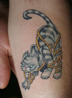 Tatuagem de um gato brincalhão enrolado em uma corda